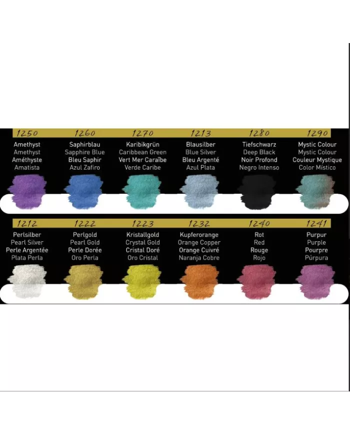 Contenu : 12 godets (Amethyst – Sapphire Blue – Caribbean Green – Blue Silver – Deep Black – Mystic Colour – Pearl Silver – Pearl Gold – Crystal Gold – Orange Copper – rouge – violet).