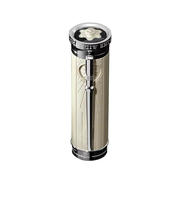 Né en 1850 à Édimbourg, en Écosse, Robert Louis Stevenson aspirait à deux choses : la liberté et la possibilité de s’immerger dans un autre univers. Il est l’auteur d’essais, de récits de voyage et d’histoires d’aventures légendaires peuplées de personnages marquants dont les noms font frissonner les lecteurs du monde entier : Long John Silver, Capitaine Flint, Jekyll et Hyde. Le coffret Montblanc Writers Edition Hommage à Robert Louis Stevenson célèbre cet écrivain à l’imagination prolifique. Le roman L’Île au trésor a inspiré de nombreux détails de cette édition. L’instrument d’écriture et les anneaux du cône forment un tout qui évoque une longue-vue historique extensible. Leur corps en résine noire précieuse est orné de croix gravées, dont un « X » plus large signalant l’emplacement du trésor sur la carte. Des lignes verticales rappellent les planches de la goélette Hispaniola, tandis que le capuchon des instruments d'écriture Writers Edition est agrémenté d’un coffre de bord traditionnel. Derrière l’agrafe platinée en forme de cabillot d’amarrage, auquel le cordage du gréement d’un navire est généralement fixé, les lignes convergent pour former une rose des vents. Le sommet du capuchon est couronné de l’emblème Montblanc orné du symbole pirate tête de mort en son centre. L’anneau du capuchon arbore quant à lui la signature de Stevenson gravée ainsi que la date de publication de sa première œuvre, The Pentland Rising, édité en 1886. Les dates de la vie de Robert Louis Stevenson, 1850-1894, sont gravées sur le capuchon. En hommage à la passion de Robert Louis Stevenson pour la navigation et à son installation dans les mers du Sud, la plume en or 18 K, rhodiée et fabriquée à la main, affiche une gravure représentant de fines vagues ainsi que le titre que les Samoans ont donné à ce grand écrivain et voyageur : Tusitala.