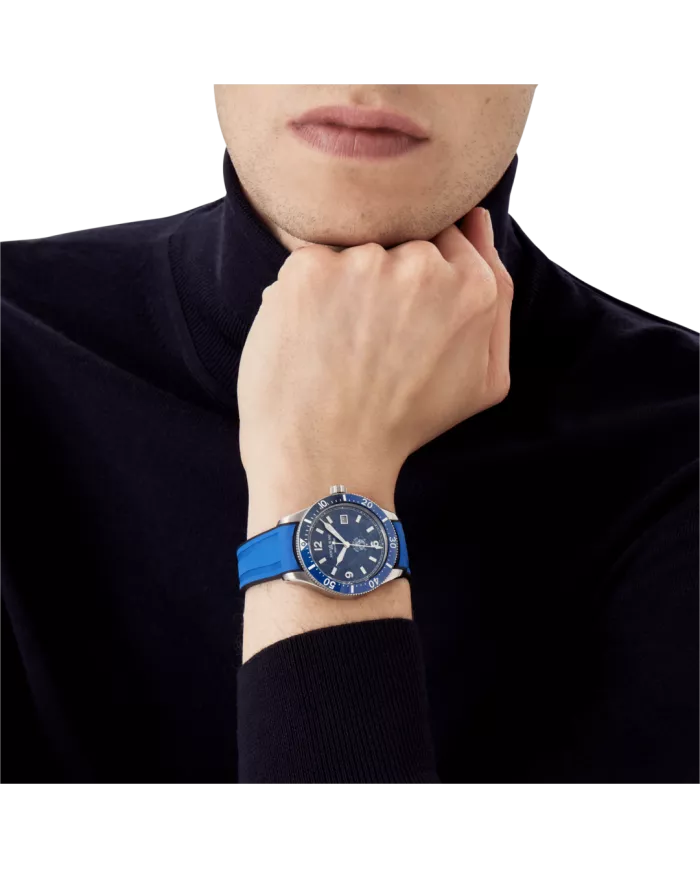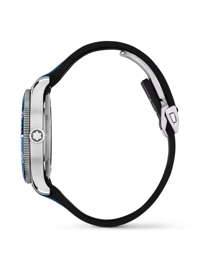 La Montblanc 1858 Iced Sea Automatic Date, toute première montre de plongée Montblanc, présente un cadran rehaussé d’un motif glacier donnant l’impression d’en voir les profondeurs. Le motif de ce cadran noir est inspiré de la Mer de Glace, principal glacier du massif du Mont-Blanc. Sa texture est le résultat d’une technique ancestrale presque oubliée appelée le gratté-boisé. La montre est dotée d’une lunette unidirectionnelle en céramique bicolore et d’un fond de boîtier gravé. Elle est montée sur un bracelet en caoutchouc noir interchangeable doté d’un système de réglage précis. Cette montre est conforme à la norme ISO 6425 pour les montres de plongée et est étanche à 300 mètres.