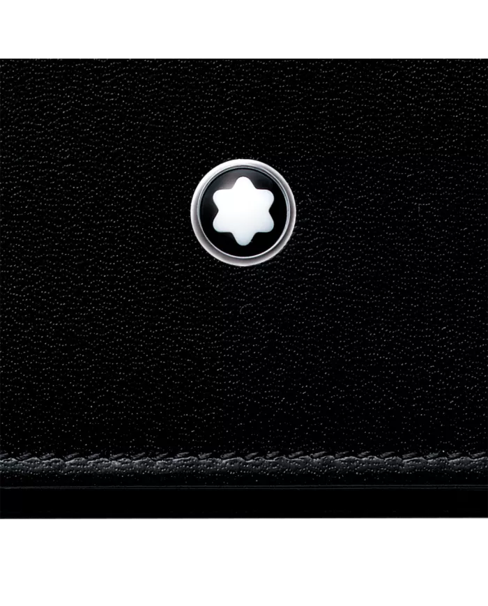 Portefeuille 12cc en cuir de veau pleine fleur européen noir, lustre Montblanc exceptionnel, doublure jacquard ornée du nom Montblanc, emblème Montblanc entouré d'un anneau palladié ; avec 12 emplacements pour les cartes de crédit, 2 compartiments pour les billets de banque, 5 poches supplémentaires